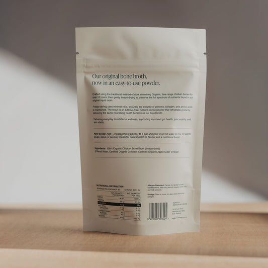 Experience the same rich, nourishing goodness as our fresh bone broth—now in a convenient freeze-dried form. We use traditional slow simmering to extract maximum nutrition, then gently freeze-dry our broth to lock in all the essential nutrients, flavour, and rich collagen content. Unlike other brands, we never use spray drying processing and you won't find any fillers or flavours.
