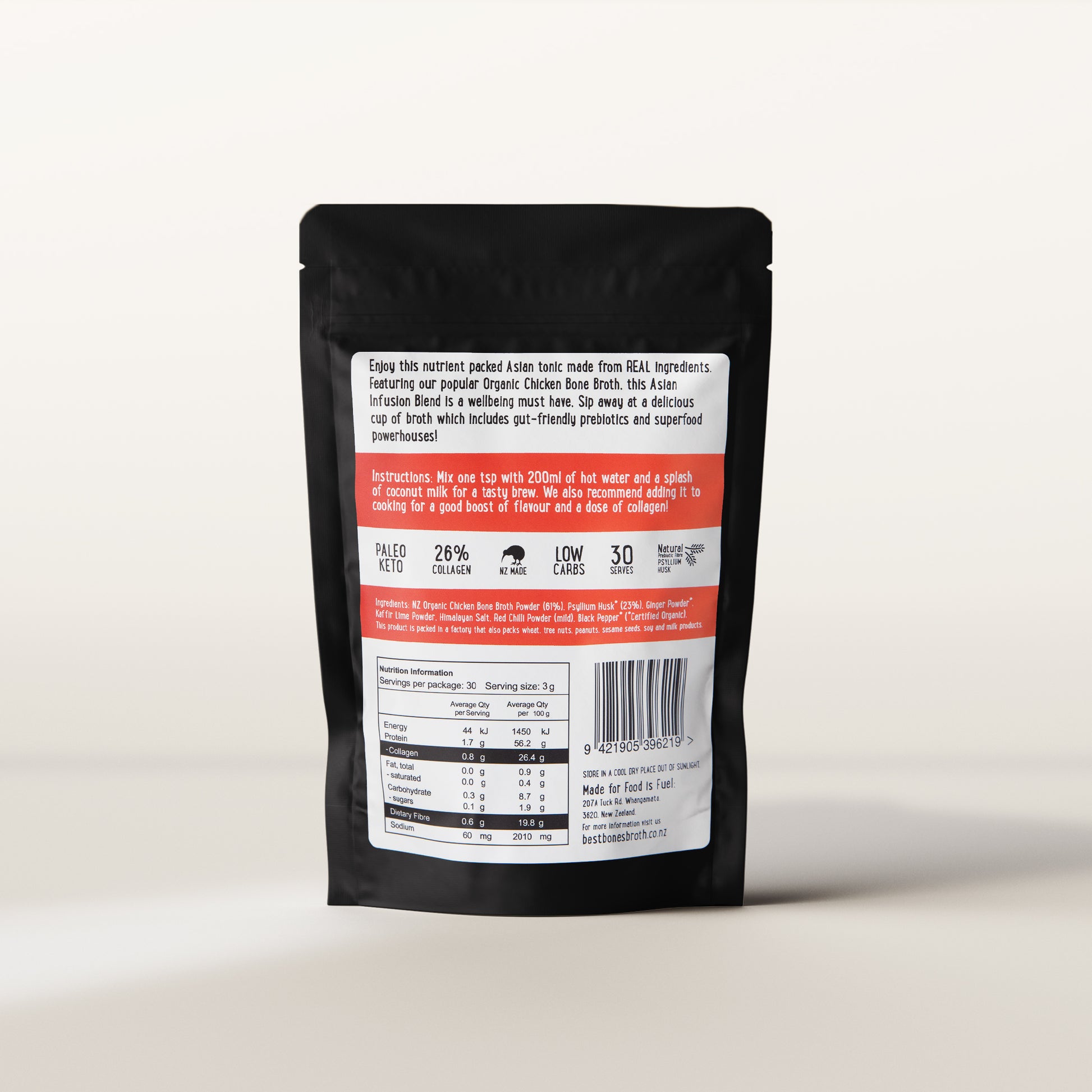 Enjoy an Asian inspired gut-healing broth made from REAL ingredients. Featuring our popular, Organic Chicken Bone Broth, this Asian Infusion is a must-have for gut health, digestion and well-being. Sip away at a delicious cup of broth which includes gut-friendly prebiotics and well-being boosters!